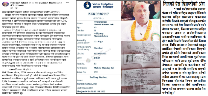 भारत विहार सितामढी जिल्ला बेल निवासी नरसिंह साहका छोरा नरेश कुमार साहले झुठो विवरण पेस गरी नेपाली नागरिकता लिएको भनी निज विरुद्ध परेको उजुरी संगै निवेदकले सन २०२२ जनवरी ६ तारिक सम्म भारतीय मतदाता सुचीमा निजको विवरण सहितको नाम उल्लेख भएको प्रमाण पेस गरेका छन ।