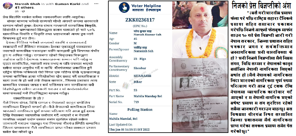 “त्यसै गरी भारतीय प्रमाण फेला परे पछि राष्ट्रिय सहारा दैनिकले प्रमाण सहित समाचार प्रकाशन गरेपछि निजले आप्mनो फेसबुक मार्फत साउन १० गते प्रेस विज्ञप्ती जारी गरी नेपाल सरकार, जिल्ला प्रशासन सहित पत्रकार जगत र सर्वशक्तिमान जननागरिकमा भनी वास्तविक्ता के हो ? भनी निजले विज्ञप्तीमा मैले नियम संगत, विधि सम्मत र नेपालको कानुन बमोजिम नेपाली नागरिकता लिएको यर्थात हो ।
