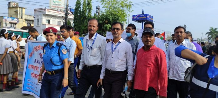 वीरगंज स्थित घण्टाघर चोकबाट निकालिएको समुदाय प्रहरी साझेदारी अन्तर्गत आत्महत्या न्यूनीकरण सम्बन्धी सचेतनामूलक र्ेयाली नगर परिक्रमा गरी पुनः घण्टाघर चोक नजिक सहिद पार्कमा पुगेर सभामा परिणत भएको थियो ।
