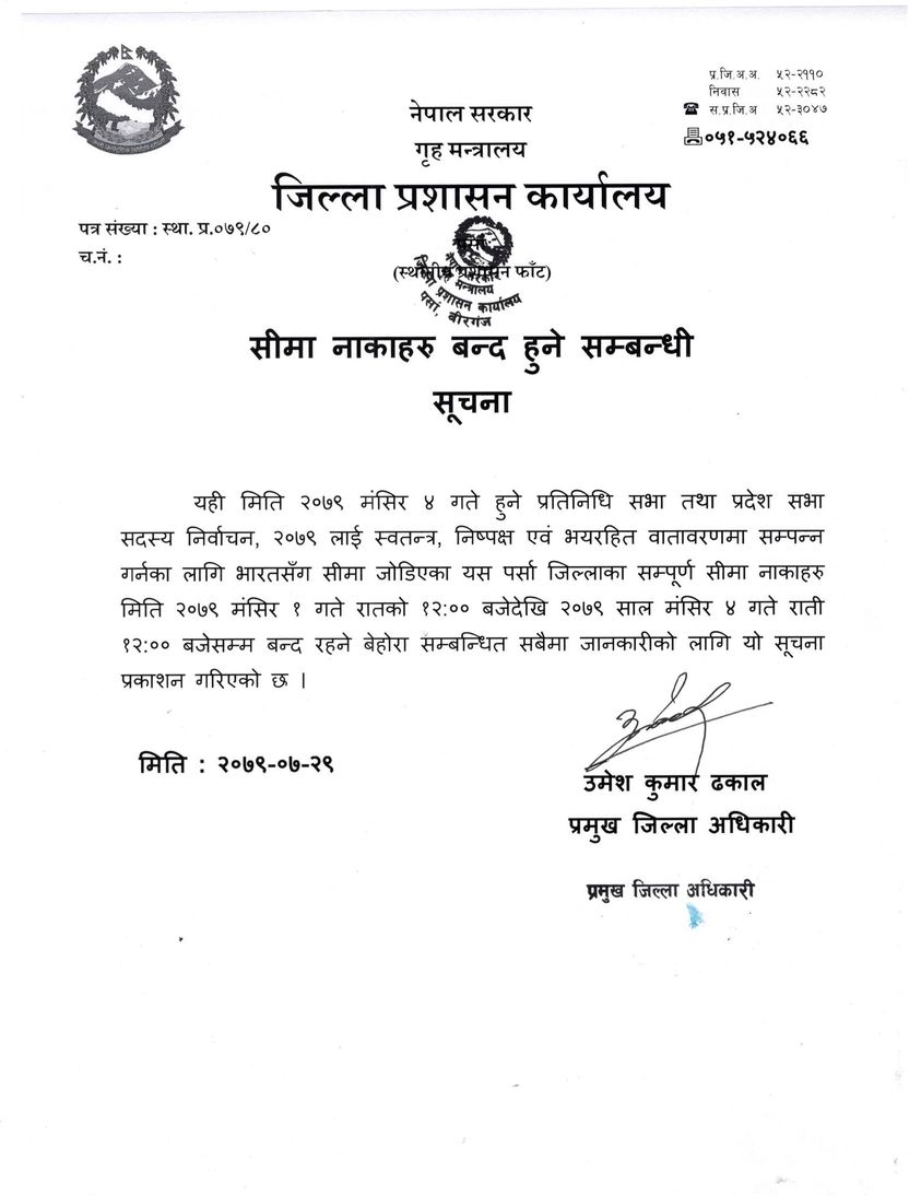 मंसिर ४ गते हुने प्रतिनिधिसभा र प्रदेशसभा सदस्य निर्वाचन २०७९ लाई लक्षित गरी जिल्ला प्रसाशन कार्यालय पर्साले मंसिर १ गते राती १२ बजे देखि मंसिर ४ गते राती १२ बजे सम्म सिमानाका बन्द रहने सुचना जारी गरेको छ ।