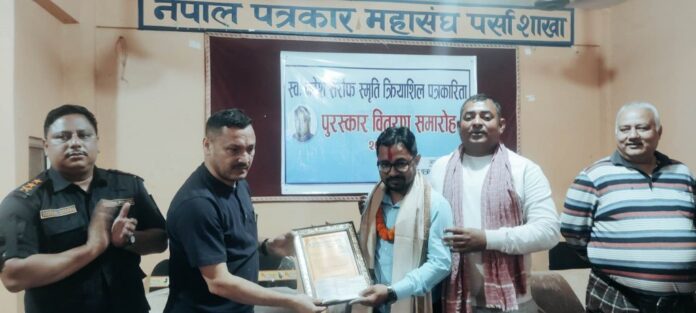 गत शनिबार पत्रकार महासंघ पर्सा शाखाको बैठकले महासंघको स्थापना दिवसको अवसरमा पत्रकार सिंहलाई पुरस्कृत गर्ने निर्णय गरेको थियो ।