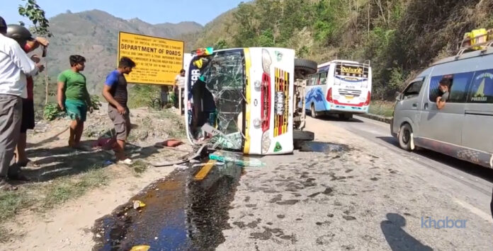 तीव्र गतिमा रहेको बस अर्को सवारीलाई उछिन्ने क्रममा भित्तामा ठोक्किएर पल्टिएको प्रहरी निरीक्षक तामाङले बताउनुभयो ।
