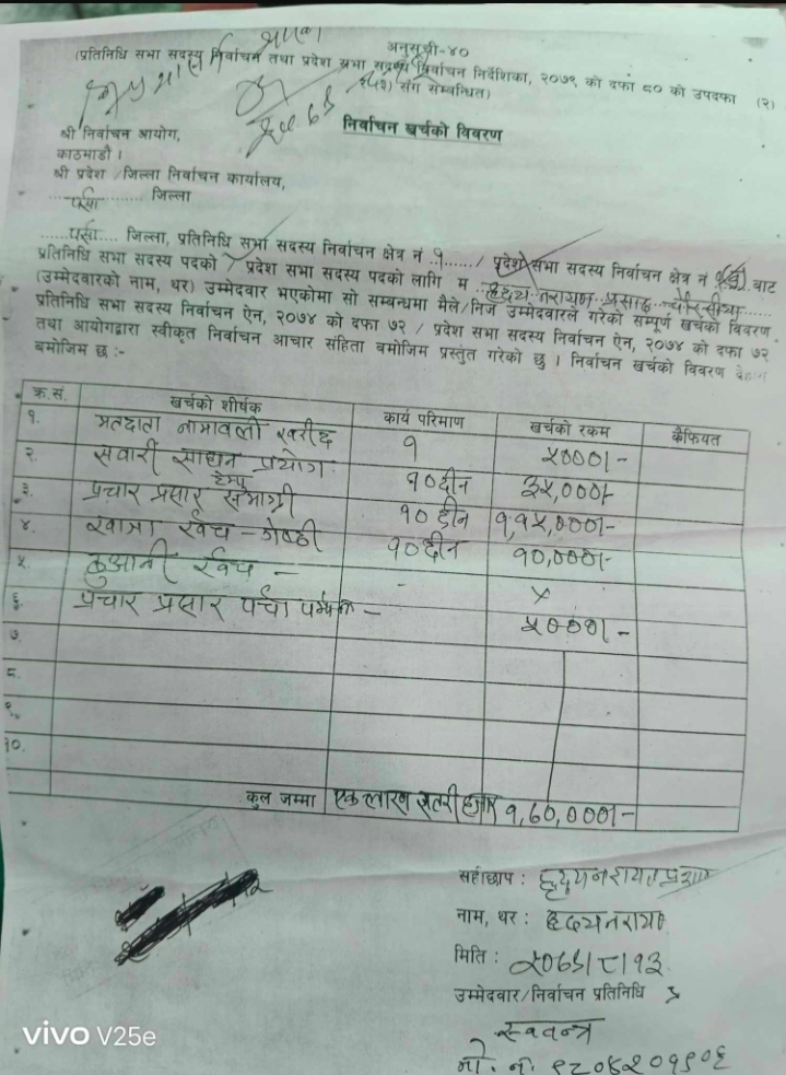 मतदाता नामावली खरीद, सवारी साधन प्रयोग, प्रचार प्रसार (टेम्पो)सामग्री, खाजा खर्च, गोष्ठी, पर्चा, पम्पलेट्सलगायतमा सो रकम खर्च भएको बरै (चौरसिया)ले बताउनु भयो।
