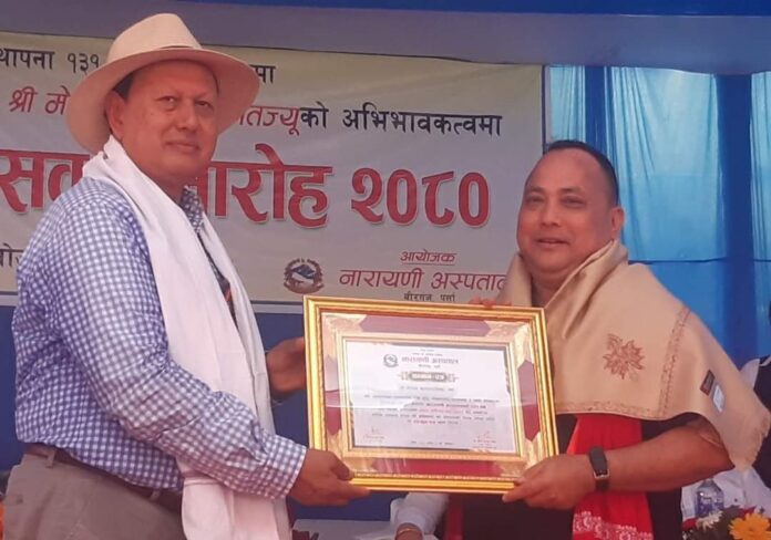 कार्यक्रममा मन्त्री बस्नेतले नारायणी अस्पतालको भौतिक पूर्वाधार निर्माणमा योगदान गरेवापत वीरगंज महानगरपालिका मेयर राजेशमान सिंह, वीरगंज उद्योग वाणिज्य संघका अध्यक्ष अनिल अग्रवाल, सहरी विकास तथा भवन कार्यालय वीरगंजका प्रमुख मदन राय लगायतलाई दोसल्ला ओढाएर सम्मान गर्नुभयो ।