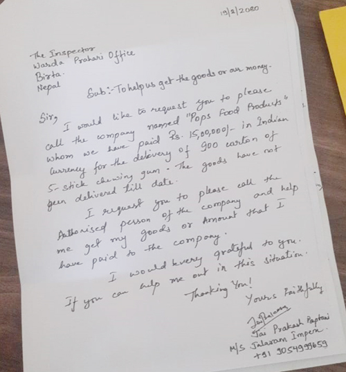पोप्स फुड प्रोडक्टसका संचालक अग्रवालले सस्तो मुल्यमा चुइगम निर्यात गरिदिने भनी ति भारतीय व्यापारीबाट रु. २५ लाख लिएर चुइगम नपठाए पछि वडा प्रहरी कार्यालय विर्तामा निवेदन दिएका थिए ।