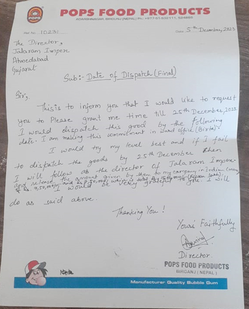 छलफलका क्रममा पोप्स फुड प्रोडक्टसका संचालक अग्रवालका छोरा पोप्स फुड प्रोडक्टसका संचालक समेत रहेका अर्विन्द अग्रवालले सन. २०२३ डिसेम्बर २५ सम्म सम्पुर्ण रकम फिर्ता गर्ने लिखित प्रतिवद्धता गरे पनि हालसम्म रकम नपठाएको भारतीय व्यापारीले गुनासो गरेका छन ।