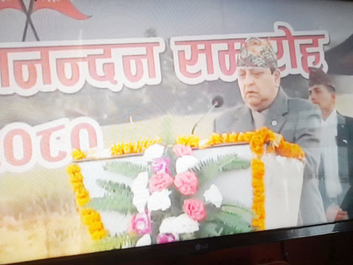 सम्बोधनका क्रममा उहाले म जता जाउँ जहाँ पुगौं–जनआवाज उठेको सुन्छु–मलाई आउ हाम्रो देश बनाउ र देश बचाउ–देशको सभ्यता र समृद्धि बढाउ । यहाँखडा भएर म भन्दछु–म बोलिरहेछु, देश बनोस्, देश बचोस् भन्ने आफ्ना पुर्ख्यौली भावना इच्छा आकाँक्षा पोखिरहेछु । म कतै अन्त गएको छैन– सदा सदा नेपालीका साथमा छु–नेपाल भित्रै छु–नेपालीहरुको सुख दुःख, सुविधा असुविधा, बाधा पीडा तथा हिजो आजको अवस्थालाई नजिकैबाट नियालीरहेको बताउनु भयो ।
