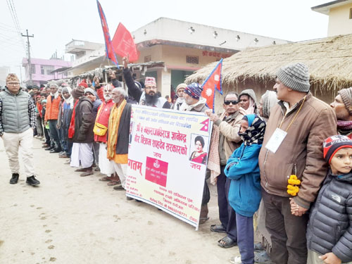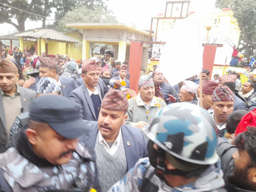 स्वागत द्वारमा लेखिएको “संविधान २०४७ बाट स्थापित र २०७२ को संविधानबाट विस्थापित श्री ५ महाराजधिराज ज्ञानेन्द्र विर विक्रम शाहदेव सरकार” सब्ध किन लेखिएको भनेर प्रहरीले अवरोध गर्दै व्यानर हटाउन खोज्दा सर्वसाधारणले विरोध गरेका थिए ।