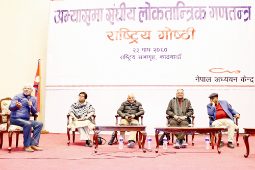 नेपाल अध्ययन केन्द्रले “अभ्यासमा संघीय लोकतान्त्रिक गणतन्त्र” विषयमा आज यहाँ आयोजना गरेको राष्ट्रिय गोष्ठीमा उनीहरुले संविधानअनुरुपका संरचना सक्रिय नभएका र राजनीतिक दलहरुमा पनि परम्परागत सोच कायमै रहेकाले अपेक्षित सुधार आउन नसकेको बताउनुभयो ।