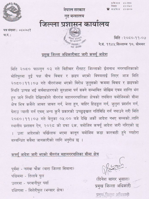 जिल्ला प्रशासन कार्यालयले वीरगंज महानगरपालिका क्षेत्रभित्र विभिन्न सिमाक्षेत्रलाई लक्षित गरी कर्फ्यू आदेश जारी गरेको हो ।