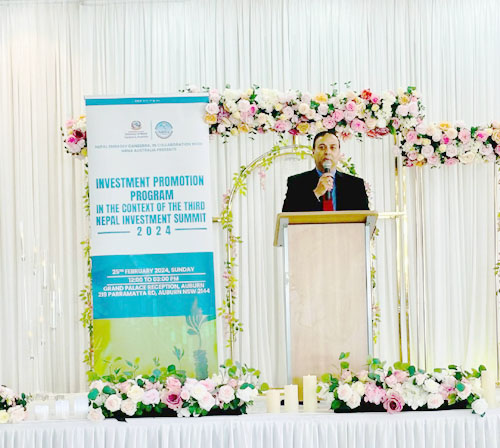 नेपाल लगानीको उत्कृष्ट गन्तव्य भएकाले निर्धक्क भएर लगानी गर्न उद्यमी–व्यवसायीलाई आहृवान गर्दै अष्ट्रेलियामा “नेपालमा लगानी प्रवर्द्धन” कार्यक्रम आयोजना गरिएको छ ।