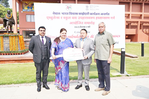 भारतीय राजदूतावास, काठमाडौंले आइतवार आयोजना गरेको कार्यक्रममा नेपालका विभिन्न जिल्लाका स्वास्थ्य र शिक्षाको क्षेत्रमा काम गर्ने संघ संस्थाहरुलाई ३५ एम्बुलेन्स र ६६ स्कुल बस उपहार स्वरुप प्रदान गरेको हो ।
