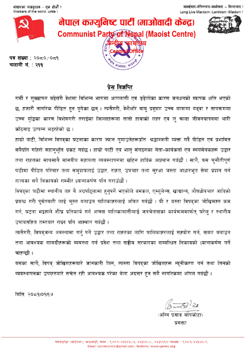 माओवादी केन्द्रका प्रवक्ता अग्नि प्रसाद सापकोटाले सोमवार एक प्रेस विज्ञप्ती जारी विभिन्न विपद्का घटनाका कारण ज्यान गुमाउनेहरूप्रति श्रद्धाञ्जली ब्यक्त गर्दै पीडित एवं प्रभावित सबैप्रति गहिरो सहानुभूति प्रकट गर्दै पार्टी एवं भातृ संगठनका नेता–कार्यकर्ता एवं स्वयंसेवकहरू उद्धार तथा राहतका साथसाथै मानवीय सहायता व्यवस्थापनमा खटिन अहृवान गरेको हो ।