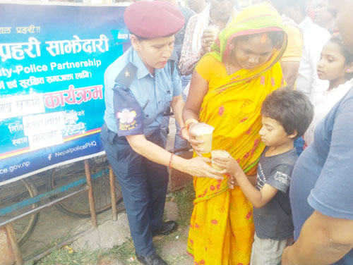 केन्द्रका अध्यक्ष वासुदेव सहनीको नेतृत्वमा बुधवार वीरगंज महानगरपालिका वडा नं. ९ घण्टाघर स्थित प्रहरी विट अगाडि सर्वसाधारणलाई सातु वितरण गरेको हो ।