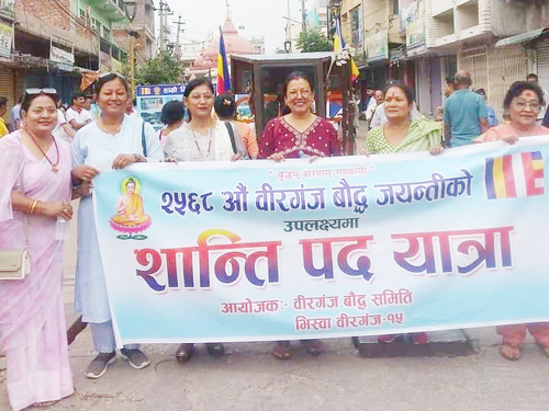बौद्ध समितिद्वारा माईस्थान चोकबाट निकालिएको शान्ति पदयात्रा नगरको परिक्रमा गरी वीरगंज महानगरपालिका वडा नं. १५ भिस्वा डांडा स्थित बौद्ध बिहार परिसरमा पुगेर समापन गरेको थियो ।