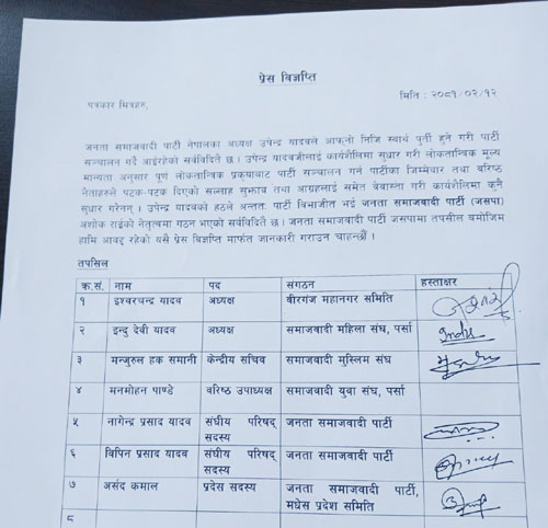 आइतबार संयुक्त विज्ञप्ति जारी गरी ती भातृ संगठनका अध्यक्षहरुले तत्कालिन जनता समाजवादी पार्टी नेपालका अध्यक्ष उपेन्द्र यादव माथि आफ्नो निजी स्वार्थ पुर्ति हुने गरि पार्टी संचालन गरेकाले पार्टी विभाजन हुन पुगेको भन्दै आफूहरु नवगठित पार्टी रोजेको उल्लेख गरेका छन ।