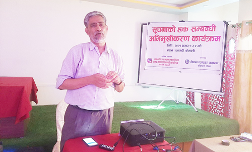 धनगढी उपमहानगरपालिकाको आर्थिक सहयोग तथा नेपाल पत्रकार महासंघ कैलाली शाखाको समन्वयमा आज धनगढीमा आयोजित सूचनाको हकसम्बन्धी अभिमुखीकरण कार्यक्रममा अध्यक्ष झाले सूचनाको हकविना लोकतन्त्र सफल हुननसक्ने बताउनुभयो ।