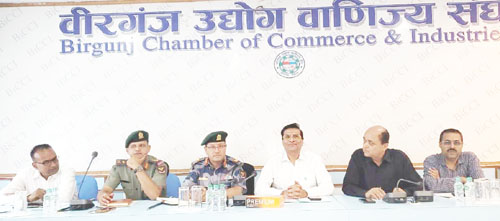 प्रहरी नायब महानिरीक्षक धौवजीले सीमा क्षेत्रमा सुरक्षा व्यवस्था कडा बनाइने, राजश्व अभिबृद्धिका लागि अवैद्य व्यापार नियन्त्रण गर्ने लगायतका बिषयहरु हाम्रो प्राथमिकतामा रहेको बताउदै वीरगंज उद्योग वाणिज्य संघ संग निरन्तर सम्वाद र छलफल गरिरहने बताउनु भयो ।