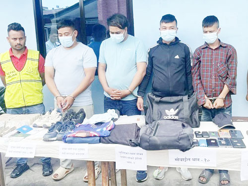 उपत्यका अपराध अनुसन्धान कार्यालयका प्रहरी उपरीक्षक अङ्गुर जिसीका अनुसार ओखलढुङ्गा मानेभन्ज्याङ(३ घर भइ हाल ललितपुर बस्ने ३५ वर्षीय मोनाराज राई, सिन्धुपाल्चोक भोटेकोशी गाउँपालिका २ का ३१ वर्षीय भीमबहादुर तामाङ, सिन्धुपाल्चोक बाह्रबिसे नगरपालिका २ का ३१ वर्षीय सुजन रसाइली तथा सिन्धुपाल्चोक भोटेकोशी गाउँपालिका २ घर भई हाल नेपाल प्रहरीको “सशस्त्र प्रहरी दुई नम्बर गण महाराजगञ्ज” मा कार्यरत ३८ वर्षीय प्रहरी हबल्दार कृष्णबहादुर बोहरालाई पक्राउ गरिएको हो ।