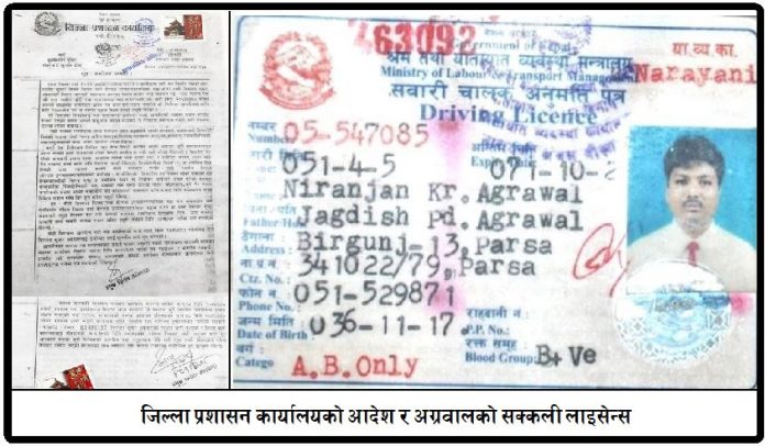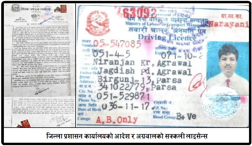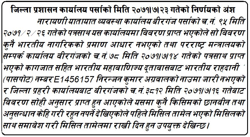 त्यती वेला दलालहरुले निरन्जन अग्रवाललाई भारतीय देखाउन जिल्ला प्रशसन कार्यालय र जिल्ला प्रहरी कार्यालय पर्सामा पेश परेको प्रमाणको रुपमा लाइसेन्स र पास्पोर्ट सम्बन्धी कागजात बारे यातायात कार्यालय, भारतीय महावाणिज्यदुतावास र परराष्ट्रमन्त्रालय मार्फत अनुसन्धान गरी उक्त कागजातलाई आधारहिन एवं नक्कली सावित गरिसकेको थियो भने जिल्ला प्रशासन कार्यालयले अब अनुसन्धान गर्नु नपर्ने समेत निर्णय पनि गरेको थियो ।