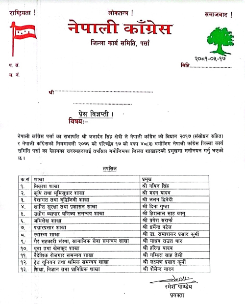 प्रवक्ता पाण्डेले सोमवार एक प्रेस विज्ञप्ती जारी गरी नेपाली कांग्रेसको विधान २०१७ (संसोधन सहित) र नेपाली कांग्रेसको नियमावली २०७६ को परिच्छेद १७ को दफा ४८ (३) बमोजिम जिल्ला कार्य समिति पर्साका सदस्यहरुलाई विभिन्न विभागका शाखा प्रमुखहरुमा मनोनयन गरिएको जानकारी दिनु भएको हो ।