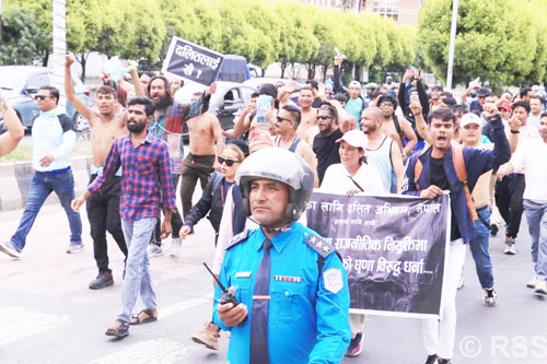 समानुपातिक समावेशी प्रतिनिधित्वलगायत दलितहरूको आत्मसम्मान र सशक्तिरणका लागि संविधानप्रदत्त अधिकार कार्यान्वयनको माग गर्दै दलित युवाहरूले अर्धनग्न प्रदर्शन गरेका छन् ।