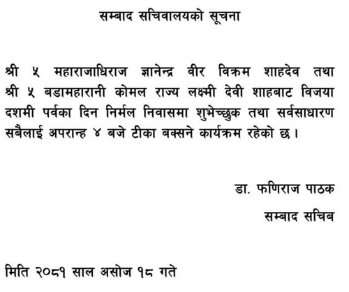 सुचनामा विजया दशमीका दिन असोज २६ गते अप्राहन्न ४ बजे निर्मल निवासमा सुभेक्छुक तथा सर्वसाधारन सबैलाई टिका वक्सने कार्यक्रम रहेको जनाइएको छ ।