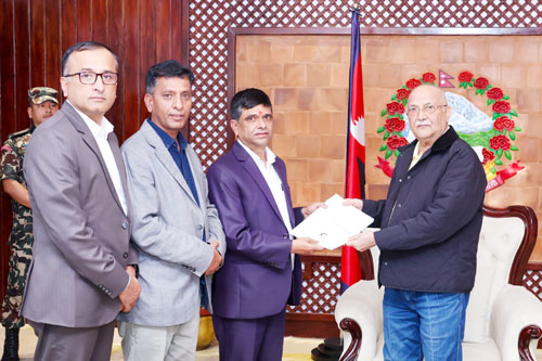 प्रधानमन्त्री एवं नेपाल कम्युनिष्ट पार्टी (एमाले) का अध्यक्ष ओलीलाई आज प्रधानमन्त्री निवास, बालुवाटारमा भेटेर एमालेको जनसङ्गठन रहेको महासङ्घका संयोजक भगीरथ सापकोटासहितको प्रतिनिधिमण्डलले “सुदृढ अर्थतन्त्र निर्माणको आधारः सबल निजी क्षेत्र र बलियो पूर्वाधार” को लक्ष्य लिइएको सुझावपत्र बुझाएको हो ।