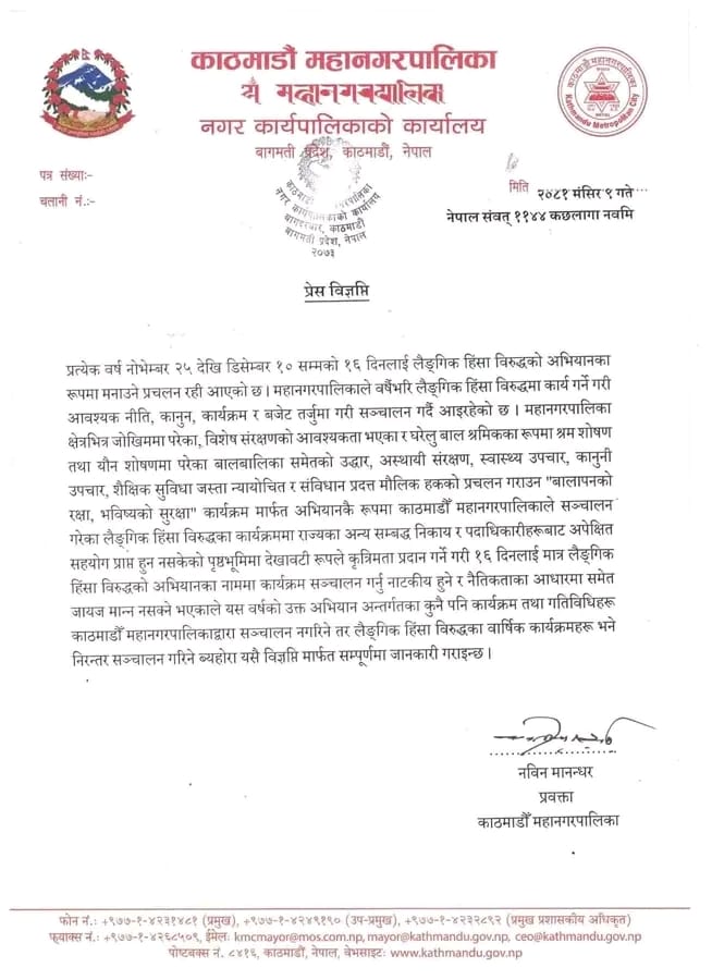 महानगरपालिका क्षेत्रभित्र जोखिममा परेका, विशेष संरक्षणको आवश्यकता भएका र घरेलु बाल श्रमिकका रूपमा श्रम शोषण तथा यौन शोषणमा परेका बालबालिका समेतको उद्धार, अस्थायी संरक्षण, स्वास्थ्य उपचार, कानुनी उपचार, शैक्षिक सुविधा जस्ता न्यायोचित र संविधान प्रदत्त मौलिक हकको प्रचलन गराउन “बालापनको रक्षा, भविष्यको सुरक्षा” कार्यक्रम मार्फत अभियानकै रूपमा काठमाडौं महानगरपालिकाले सञ्चालन गरेका लैंगिक हिंसा विरुद्धका कार्यक्रममा राज्यका अन्य सम्बद्ध निकाय र पदाधिकारीहरूबाट अपेक्षित सहयोग प्राप्त हुन नसकेको पृष्ठभूमिमा देखावटी रूपले कृत्रिमता प्रदान गर्ने गरी १६ दिनलाई मात्र लैंगिक हिंसा विरुद्धको अभियानका नाममा कार्यक्रम सञ्चालन गर्नु नाटकीय हुने र नैतिकताका आधारमा समेत जायज मान्न नसक्ने भएकाले यस वर्षको उक्त अभियान अन्तर्गतका कुनै फनि कार्यक्रम तथा गतिविधिहरू सञ्चालन नगरिने तर लैंगिक हिंसा विरुद्धका वार्षिक कार्यत्रमहरू भने निरन्तर सञ्चालन गरिने विज्ञप्तिमा उल्लेख छ ।