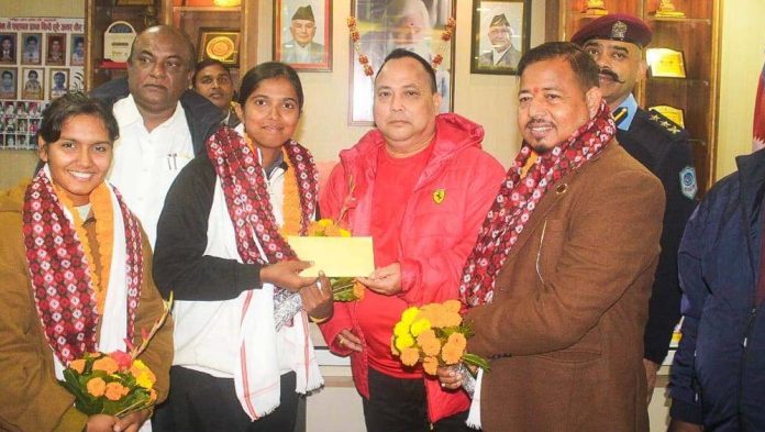 वीरगंज, ०९ पुस । नेपाली राष्ट्रिय टिमकी कप्तान पूजा महतोलाई वीरगंज महानगरपालिकाले मंगलवार सम्मान गरेको छ । नगरप्रमुख राजेशमान सिंहले महतोलाई खादा ओढाएर नगद २५ हजार सहित सम्मान गरेका हुन् । यू–१९ विश्वकप क्रिकेटमा नेपाललाई पु¥याउन कप्तान महतोको योगदान प्रशंसनीय रहेको नगरप्रमुख सिंहले बताए । यसैगरी यू–१९ नेपाली राष्ट्रिय टिमकी सदस्य साना प्रविनलाई पनि मेयर सिंहले सम्मानित गरे । वीरगंज–१३ निवासी सानालाई यसअघि मंसिर ९ नगरप्रमुख सिंहले नगद ५१ हजार रुपियाँँ प्रदान गर्दै सम्मानित गरेका थिए । गत मंसिरमा सम्पन्न यू–१९ टी–२० महिला एसिया क्वालिफायरमा थाइल्याण्डविरूद्धको खेलमा सानाले अर्धशतक प्रहार गर्दै कप्तान पूजा महतोसंग मिलेर नेपालका लागि कीर्तिमानी साझेदारी गरेकी थिइन् । कार्यक्रममा मेयर सिंहले क्रिकेटको माध्यममार्पmत मधेस र नेपालको नाम विश्वमै चिनाउन सफल भएको भन्दै कप्तान महत्तो र सानाको मनोबल र हौसला बढाउन सम्मानित गरिएको बताए । उनले मधेसका छोरीचेलीहरूले पनि केही गर्न सक्छन् है भन्ने उदाहरणको पात्रका रूपमा दुबै जना बनेको भन्दै उनले आउँदा दिनमा अझै मेहनत गरेर मधेस र नेपालको नाम विश्वमा अझ धेरै चिनाउन दुवैलाई आग्रहपनि गरे । कार्यक्रममा प्रमुख प्रशासकीय अधिकृत अरबिन्दलाल कर्ण, पर्साका प्रहरी उपरीक्षक कुमोध दुंगेल, पर्सा क्रिकेट संघका अध्यक्ष मनिष सिंह,वीरगंज–४ का वडाध्यक्ष जगत साह कानु लगायतकोपनि सहभागिता थियो ।