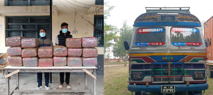 सहारा संवाददाता––––––– वीरगंज, १५ पुस । जिल्ला प्रहरी कार्यालय पर्साले ठूलो परिमाणमा गाँजासहित दुईजनालाई पक्राउ गरेको जनाएको छ । आइतवार राति ९ः३० बजेको समयमा जिल्ला पर्सा वीरगंज महानगरपालिका वडा नं. १८ भवानीपुर सिताराम चोकस्थित प्लाष्टिक कारखाना अगाडि सडकखण्डमा प्रहरी चौकी परवानीपुरले ड्राइपोर्ट आउँदै गरेको ना.३ ख ४२१२ नम्बरको ट्रक चेकजाँच गर्ने क्रममा १६० किलो गाँजा बरामद भएको जिप्रका, पर्साका प्रवक्ता प्रहरी नायब उपरीक्षक किशोर लम्सालले जानकारी गराएका छन् । ट्रकमाथि हुटमा फल्स बनाई रातो प्लाष्टिकमा बेरी लुकाइ छिपाई राखिएको १० के.जी.का दरले १६ पोकामा १६० किलो लागु औषध गाँजा बरामद भएको प्रवक्ता लम्सालले बताए । प्रहरीले ट्रकचालक एवं धनी जिल्ला मकवानपुर हेटौडा उमनपा वडा नं. ७ कमाने बस्ने ४४ वर्षीय कृष्ण घलान र चितवन जिल्ला झुरझुरे राप्ती न.पा. वडा नं. ३ बस्ने २० वर्षीय रोनाल विश्वकर्मालाई पक्राउ गरेको प्रवक्ता लम्सालले बताए । पक्राउ परेका दुवैजना व्यक्ति, लागूऔषध गाँजा र ट्रकलाई नियन्त्रणमा लिई आवश्यक अनुसन्धान गरिरहेको प्रवक्ता लम्सालले जनाएका छन् ।