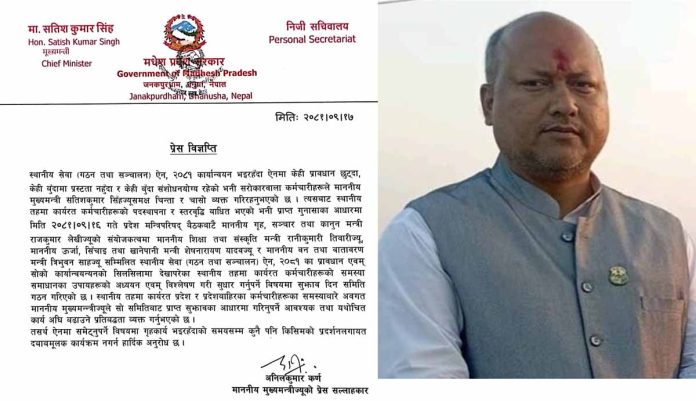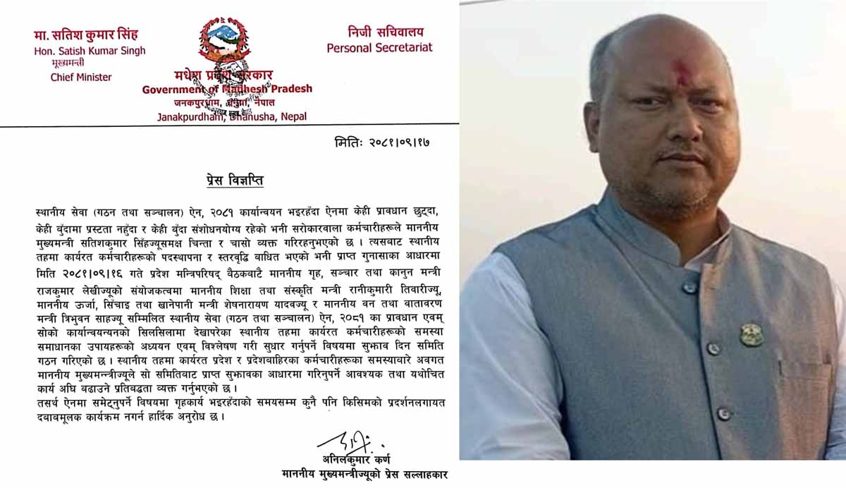 मुख्यमन्त्री सिंहद्वारा आज जारी विज्ञप्तिमा स्थानीय तहमा कार्यरत कर्मचारीका समस्याबारे आफू अवगत रहेको बताउँदै कर्मचारीका समस्या समाधानका लागि आवश्यक प्रयास भइरहेकाले कुनै किसिमका प्रदर्शन वा कार्यक्रम नगर्न आग्रह गरिएको छ ।