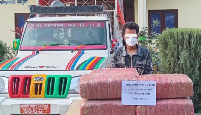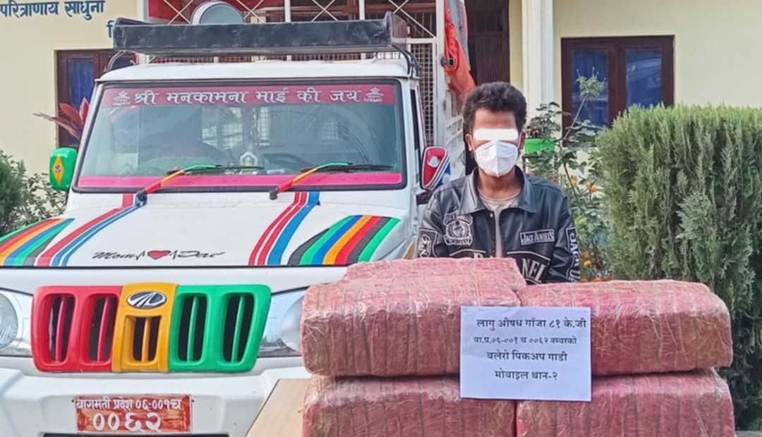 वीरगंज, ०९ माघ । इलाका प्रहरी कार्यालय मनहरीले मकवानपुर जिल्लाको मनहरी गाउँपालिका वडा नं. ८ सिम्पानी स्थित लोकमार्ग सडकखण्डमा चेक जाँच गर्ने क्रममा ८१ किलो गाँजासहित एकजना पक्राउ परेका छन् । राक्सीराङ चैनपुरबाट हेटौडा आउँदै गरेको बा.प्र.०६–००१ च ००६२ नं.को बोलेरो पिकअप गाडीमा शंका लागी चेकजाँच गर्दा चालक जिल्ला मकवानपुर कैलाश गाउँपालिका वडा नं.४ बस्ने वर्ष २२ को छेडुप थिङलाई पक्राउ गरेको बताए । थिङमाथि लागू औषध गाँजा मुद्दामा अनुसन्धान भइरहेको प्रहरीले जानकारी गराएका छन ।