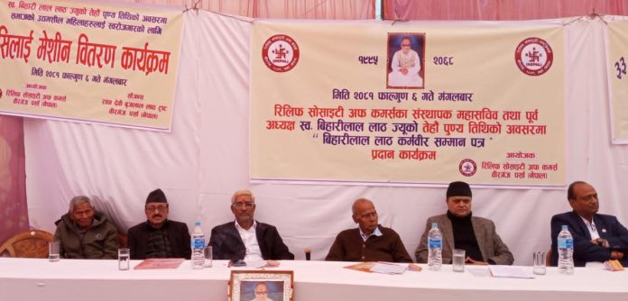 वीरगंज, ६ फागुन । रिलिफ सोसाइटी अफ कमर्सका संस्थापक महासचिव तथा पूर्वअध्यक्ष स्व. बिहारीलाल लाठको तेहौं पुण्यतिथिको अवसरमा बिहारीलाल लाठ कर्मवीर सम्मान–पत्र प्रदान गरिएको छ । आशा किरण केन्द्रका सुनिल गुप्ता, यशोधा गजुरेल एवम् अनिता साहलाई सम्मान गरिएको थियोे । कार्यक्रममा उपाध्यक्षमा नारायण रूङटा ४ वर्षको लागि निर्बिरोध निर्वाचित भएका थिए । उनलाई निर्वाचन अधिकृत खरेलले सपथ ग्रहण गराएका थिए । यसैगरी राधादेबी बृजलाल लाठ ट्रस्ट वीरगंज पर्साको सहयोगमा १५ ओटा सिलाई मेसिन गरीब तथा असहाय महिलाहरूलाई आत्मनिर्भर बनाउने उद्देश्यले वितरण गरिएको थियो । रिलिफका अध्यक्ष योगेन्द्र प्रसाद यादवको अध्यक्षतामा भएको कार्यक्रममा प्रमुख अतिथि मुर्लीधर रूङटा, वरिष्ठ अधिवक्ता बालमुकुन्द खरेल, वीरगंज उद्योग वाणिज्य संघका उपाध्यक्ष माधव राजपाल, समाजसेवी गणेश लाठ, सचिव प्रेमचन्द्र गोयल, हरि गौतमको उपस्थिति रहेको थियो। रिलिफ सोसाइटी अफ कमर्स वीरगंजका महासचिव निरज अग्रवालले कार्यक्रम संचालन गरेका थिए ।