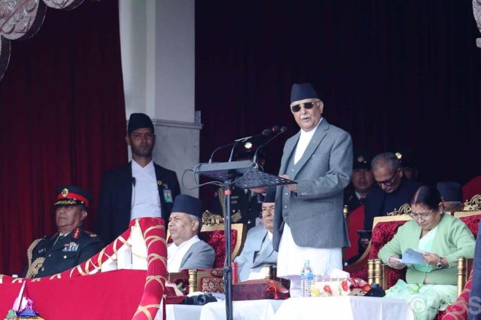 काठमाडौँ, ७ फागुन : प्रधानमन्त्री केपी शर्मा ओलीले वर्तमान सरकार लोकतन्त्रलाई पारदर्शी र अझ जवाफदेही बनाउँदै समाजमा व्याप्त असमानता, गरिबी र भ्रष्टाचारको चुनौतीलाई चिरेर अघि बढ्ने बताउनुभएको छ । राष्ट्रिय प्रजातन्त्र दिवस–२०८१ का अवसरमा आज सैनिक मञ्च टुँडिखेलमा आयोजित समारोहलाई सम्बोधन गर्दै उहाँले युवाहरुलाई सशक्त बनाएर नै मुलुकलाई समृद्धितर्फ लैजाने सरकारको नीति रहेको स्पष्ट पार्नुभयो ।
