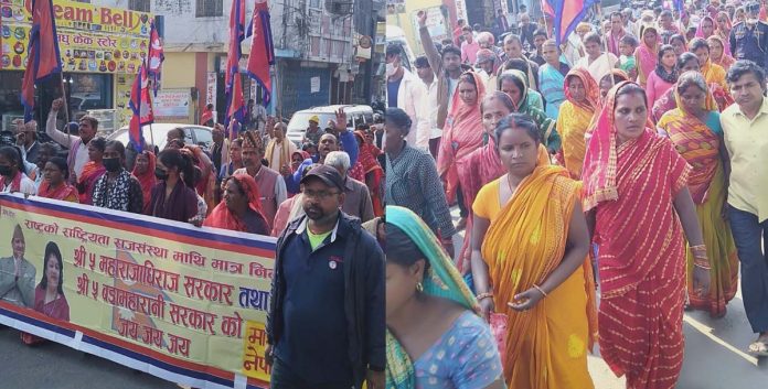 यसैबीच वीरगंजमा देशभक्त राजभक्त समूह तथा नेपाल राष्ट्रवाद संघ, राप्रपालगायतले बुधवार प्रदर्शन गर्दै राजा आउ देश बचाउको नारा लगाएका छन् । वीरगंजको घण्टाघरमा भेला भई निस्किएको जुलुसले नेता चोर देश छोड, राजसंस्था कायम गर, हिन्दु राज्य कायम गर, संघीयता खारेज गर, आर्यघाटले के भन्छ–गणतन्त्र ले भन्छ, मेची महाकाली हल्ला छ, राजा ल्याउने सल्लाह छ, गणतन्त्र मुर्दाबाद’ नारा लगाउँदै नेताप्रति आक्रोश पोखेको थियो । वीरगंजको माइस्थान, अलखियामठ, आदर्शनगर, गीता मन्दिर हुँदै फेरि घण्टाघरमा पुगेर कोणसभामा परिणत भएको थियोे । कोणसभामा वक्ताहरूले देशलाई झन बर्बादीबाट जोगाउन राजसंस्था अपरिहार्य भएको र संघीयता खारेज गर्नुपर्ने तथा हिन्दु राज्य कायम गर्नुपर्ने कुरामा जोड दिएका थिए । कार्यक्रममा देशभक्त राजभक्त समूहका अध्यक्ष दीपेन्द्र रौनियार, राष्ट्रिय नागरिक संघर्ष समितिका अब्दुल सतार अन्सारी, राप्रपा पर्साका उपाध्यक्ष तथा मधेस प्रदेश सदस्य शान्ति खड्का, क्षेत्र नं. १ का अध्यक्ष अर्जुनसिंह ठकुरी, नेपाल राष्ट्रवाद संघका केन्द्रिय अध्यक्ष जनक साह, विश्व हिन्दु महासंघका के. सदस्य पृथ्वी झा, समाजसेवी पशुपति विक्रम शाहलगायत जनसमुदायको उल्लेख्य सहभागिता थियो ।