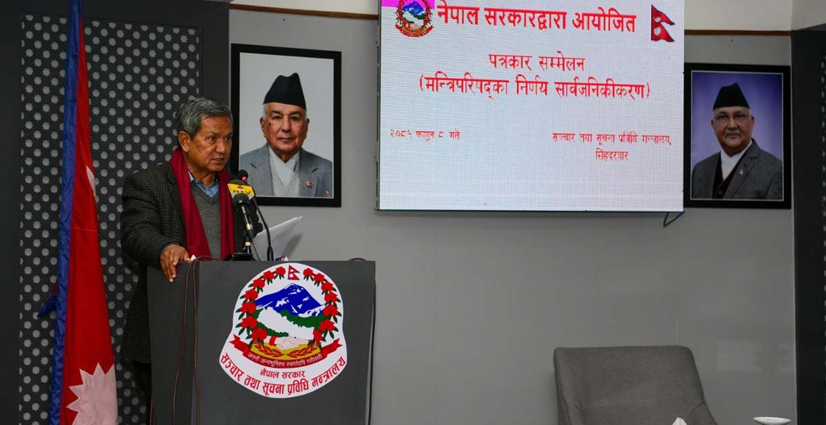 यसैगरी सरकारका नाममा दर्ता रहेको सरकारी जग्गामा प्रसूति गृह निर्माण, स्वास्थ्य चौकी भवन निर्माण, वडा कार्यालय भवन निर्माण र आयुर्वेद औषधालय भवन निर्माणका लागि मायादेवी गाउँपालिका, रुपन्देहीलाई उपयोग गर्न स्वीकृत दिने रहेको छ । सरकारको नाममा दर्ता रहेको सार्वजनिक प्रकृतिको जग्गा जिल्ला प्रहरी कार्यालय रुकुमपूर्वलाई प्रयोग गर्न स्वीकृति दिने, सरकारको नाममा दर्ता रहेको सार्वजनिक प्रकृतिको जग्गा बहुउद्देश्यीय पोलिटेक्निकल इन्टिच्युट (व्यवसायी प्रशिक्षण केन्द्र) भवन निर्माण प्रयोजनका लागि श्रम, रोजगार तथा सामाजिक सुरक्षा मन्त्रालयलाई प्रयोग गर्न स्वीकृति दिने, नेपाल सरकार र ओमान सरकारबीच हुने पर्यटन क्षेत्रमा सहयोग आदानप्रदानसम्बन्धी समझदारीपत्र स्वीकृत गर्ने, नेपाल र संयुक्त अमेरिकाबीच हुने पुरातात्विक तथा समुदायको संस्कृतिसँग सम्बन्धित सामग्रीको ओसारपसार र आयात प्रतिबन्धसम्बन्धी सम्झौता स्वीकृत गर्ने मन्त्रिपरिषद्को बैठकले निर्णय गरेको छ ।