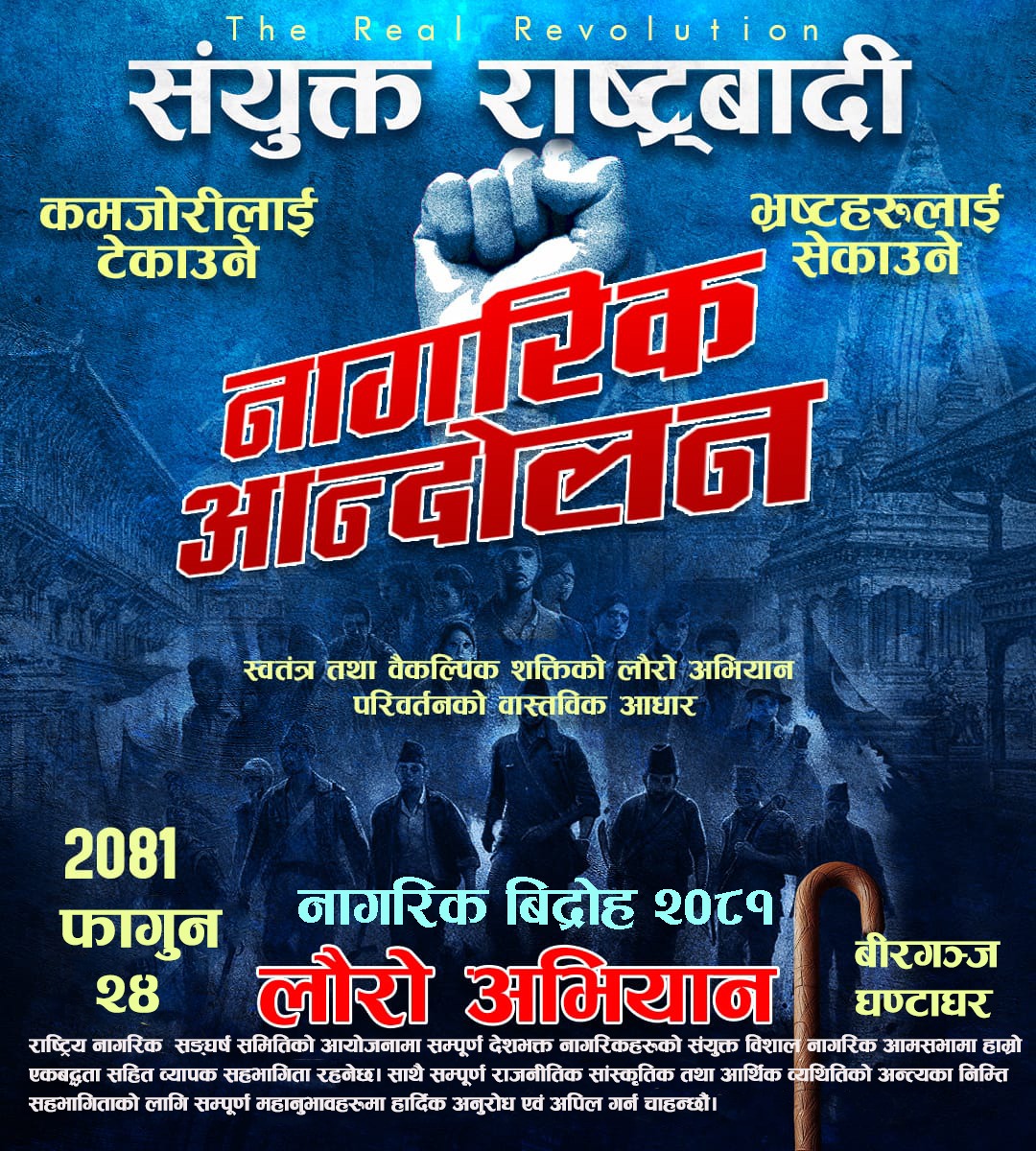 फागुन २४ गते वीरगंजमा राष्ट्रिय नागरिक संघर्ष समितिको आयोजनामा सम्पूर्ण देशझक्त नागरिकहरूको संयुत्त विशाल नागरिक आमसभामा हाम्रो एकबद्धता सहित व्यापक सहभागिता रहने लौरो अभियानले जनाएको छ ।