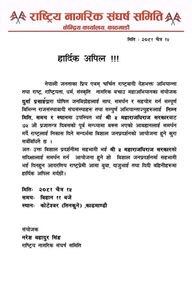 सहारा संवाददाता––––––––––––––– वीरगंज, १४ चैत । राष्ट्रिय नागरिक संघर्ष समिति केन्द्रीय कार्यालय, काठमाडौंले आज अपील जारी गर्दै नेपाली जनताका प्रिय एवम् चर्चित राष्ट्रवादी देशभक्त अभियन्ता नयाँ राष्ट्र, राष्ट्रियता, धर्म, संस्कृति नागरिक बचाउ महाअभियानका संयोजक दुर्गा प्रसाईद्वारा घोषित जनविद्रोहलाई साथ समर्थन र सहयोग गर्न सम्पूर्ण राज संस्थावादी संघसंस्थाहरूलाई आह्वान गरेको छ । राष्ट्रिय नागरिक संघर्ष समितिका संयोजक नरेश बहादुर सिंहले जारी गरेको अपीलमा श्री ५ महाराजधिराज ज्ञानेन्द्र वीर विक्रम शाहबाट ७५ औं प्रजातन्त्र दिवसको पूर्वसन्ध्यामा दिनुभएको आव्हानलाई समर्थन गर्दै राष्ट्रलाई निकास दिने सन्दर्भमा चैत १५ गते विशाल जनप्रदर्शनको आयोजना हुने भएको जनाएका छन् । उनले चैत १५ गते काठमाडौंको कोटेश्वर, तीनकुनेमा बिहान ११ बजे हुने विशाल प्रदर्शनमा सहभागी भई श्री ५ महाराजधिराज सरकारको सदिक्षालाई समर्थनमा सहभागी भइदिनुहुन राष्ट्रप्रेमी आमा बुबा, दाजुभाई तथा दिदी बहिनीहरूमा हार्दिक अपिल गरेका छन् ।