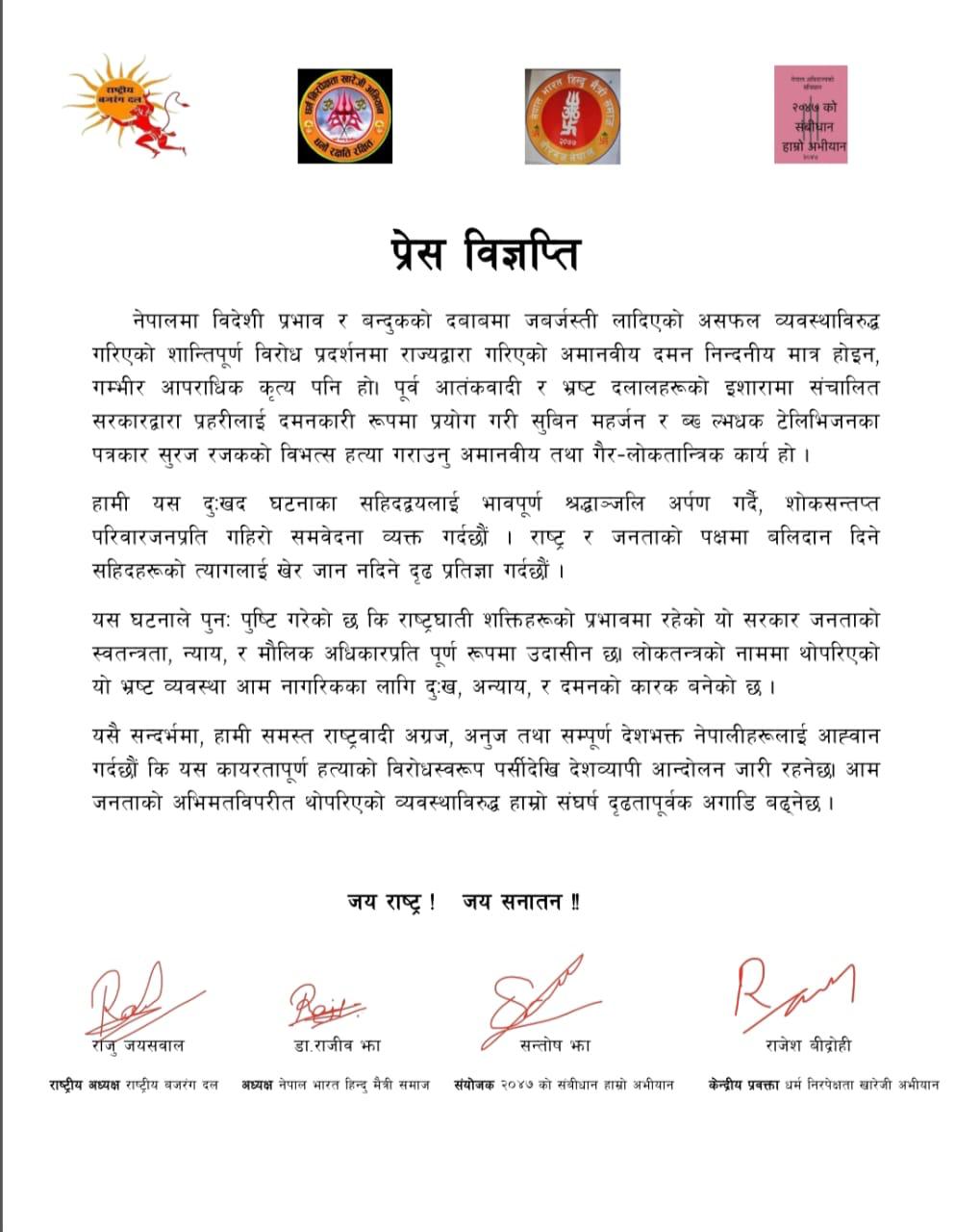 त्यस्तै राष्ट्रीय बजरंग दलका अध्यक्ष राज जयसवाल,भारत हिन्दु मैत्री समाजका अध्यक्ष डा. राजीव झा, २०४७ को संवीधान हाम्रो अभीयानका अध्यक्ष सन्तोष झा र धर्म निरपेक्षता खारेजी अभीयानका प्रवक्ता राजेश बीद्रोहीले पनि संयुक्त प्रेस विज्ञप्ती जारी गरी नेपालमा विदेशी प्रभाव र बन्दुकको दबाबमा जबर्जस्ती लादिएको असफल व्यवस्थाविरुद्ध गरिएको शान्तिपूर्ण विरोध प्रदर्शनमा राज्यद्वारा गरिएको अमानवीय दमन निन्दनीय मात्र होइन, गम्भीर आपराधिक कृत्य पनि हो भनेको छ ।
