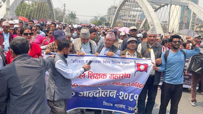 काठमाडौं, २४ चैत/ नेपाल शिक्षक महासंघले चौथो चरणको आन्दोलन घोषणा गरेको छ । यही चैत २० गतेदेखि काठमाडौंमा सडक आन्दोनल गरिरहेको महासंघले सोमवारदेखि शैक्षिक हडतालको घोषणा गरिएको महासंघ अध्यक्ष लक्ष्मीकिशोर सुवेदीले जानकारी दिनुभयो । आन्दोलन अवधिभरि उत्तरपुस्तिका परीक्षण, नतिजा प्रकाशन, तालिम गोष्ठी, शैक्षिक भ्रमणजस्ता कुनै पनि कार्यमा सङ्लग्न नहुन उहाँले आग्रह गरेका छ । महासंघको अगुवाइमा विद्यालय शिक्षा विधेयक जारी गर्नुपर्ने माग राख्दै आन्लोन भइरहेको छ । महासंघ अध्यक्ष सुवेदीले विगतमा भएका सहमतिअनुसार विधेयक जारी गर्नुपर्ने र सो नभएसम्म आन्दोलनमै रहने बताउनुभयो । उहाँले अध्यादेशबाट भए पनि विगतमा गरिएका सहमतिअनुसार विधेयक जारी गर्नुपर्ने माग गर्नुभयो ।