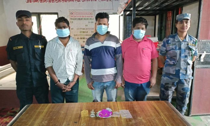 वीरगंज, २५ चैत । वीरगंज भन्सार कार्यालय परिसरबाट सुनको गहनासहित तीनजना पक्राउ परेका छन् । नेपालबाट भारत जाने क्रममा भारत, पश्चिम बङ्गाल प्रान्त जिल्ला पश्चिम मेदिनीपुर स्थित किशोरनगर बस्ने अन्दाजी वर्ष ३५ को सौमेन गुचैट, र जोतेकानुरामगढ बस्ने अन्दाजी वर्ष २५ को अमित दास र हुगली, नन्दपुर बस्ने बटु रंग रहेको सशस्त्र प्रहरीले जनाएको छ । उनीहरूबाट सुनको गरगहना झुम्का २ सेट अन्दाजी ८२ लाल, रिङ्ग १ सेट अन्दाजी ३० लाल, सिक्री लकेट १ थान अन्दाजी ३० लाल,सुनको गणेश लक्ष्मी मूर्ती अङ्गित लकेट १ थान अन्दाजी ४ लाल, सुनका टुक्राहरू अन्दाजी १ तोला गरी जम्मा अन्दाजी २ तोला ६६ लाल एवं चाँदीको लक्ष्मीको मूर्ती अन्दाजी २ तोला रहेको सशस्त्रका डिएसपी लोकेन्द्र सुब्बाले जानकारी गराए । पक्राउ परेकाहरुले आफू भक्तपुर जिल्लाको ठिमी न.पा., वडा नं.–१, लोकन्थलीमा सगरमाथा खोटाङ्ग सुनचाँदी पसल संचालन गर्ने भक्त गदाल विक र काठमाण्डौ म.न.पा., वडा नं.३२, नरेफाँटमा ओमशान्ति ज्वेलर्स संचालन गर्ने श्रवण घिमिरेको लागि काम गर्ने र अर्डर अनुसार जडिबुटीमा सुन बनाउने कारखानामा काम गर्दै आएको बताए । अर्डर आएको ग्राहकका सुन लिई भागेको सूचनाको आधारमा उनीहरुलाई पक्राउ गरिएको सशस्त्र प्रहरीको वरिष्ठ हवल्दार गंग बहादुर विकले जनाएको छ । सुनको तयारी गरगहना, सुनको टुक्राहरू र चाँदीको मूर्ती सहित फेला परेको हुँदा प्रहरी चौकी ईनरूवामा अनुसन्धानको लागि पठाइएको प्रहरीले जनाएको छ ।