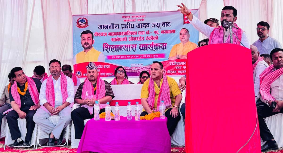 वीरगंज,२७ वैशाख/ संघीय सरकारका खानेपानीमन्त्री प्रदीप यादवले खानेपानीजस्तो आधारभूत सेवाको पहुँच प्रत्येक नागरिकसम्म पु¥याउनु सरकारको दायित्व भएको बताएका छन् । शनिवार वीरगंज महानगरपालिका वडा नम्बर १६ नगवामा खानेपानी वितरणका लागि ४ करोड ५० लाखको लागतमा ओभरहेड ट्यांकीको निर्माण कार्यको शिलान्यास गर्दै मन्त्री यादवले सो कुरा बताएका हुन् । उनले आयोजना तोकिएको समयसीमा भित्र सफलतापूर्वक सम्पन्न हुनुपर्नेमा जोड दिए । मन्त्री यादवले खानेपानी ओभरहेड टंकी निर्माणपछि नगवा र त्यस आसपासको क्षेत्रका बासिन्दालाई शुद्ध, सुरक्षित र व्यवस्थित रूपमा खानेपानी उपलब्ध हुने बताए । वीरगज महानगरपालिकाका मेयर एंव नेपाल खानेपानी संस्थान सञ्चालक समितिका सदस्य राजेशमान सिंहले खानेपाानी मन्त्रालयको नगवा खानेपानी योजना अन्तर्गत त्यहाँ ४५० घनमिटर क्षमताको खानेपानी ओभरहेड टंकी निर्माण गर्न थालिएको बताए । मेयर राजेशमान सिंहले नगवामा खानेपानी ओभरहेड टंकीको निर्माणपछि वडा नम्बर १६ का नागरिकले सहज रूपमा शुद्ध र स्वच्छ खानेपानी पाउने बताए । वडा सदस्य लवंगी देवीको अध्यक्षतामा भएको शिलान्यास कार्यक्रममा नेपाल खानेपानी संस्थानका महाप्रबन्धक अर्जुनबाबु ढकाल, जसपाका जिल्ला अध्यक्ष सिंघासन साह तेली, जिल्ला समन्वय समिति पर्साका प्रमुख अजय सर्राफ, पूर्व प्रदेशसभा सदस्य जन्नत अन्सारी,जसपाका केन्द्रीय सदस्यहरू पुरषोत्तम लाल झा, मधुमाया यादवलगायतको सहभागिता थियो ।