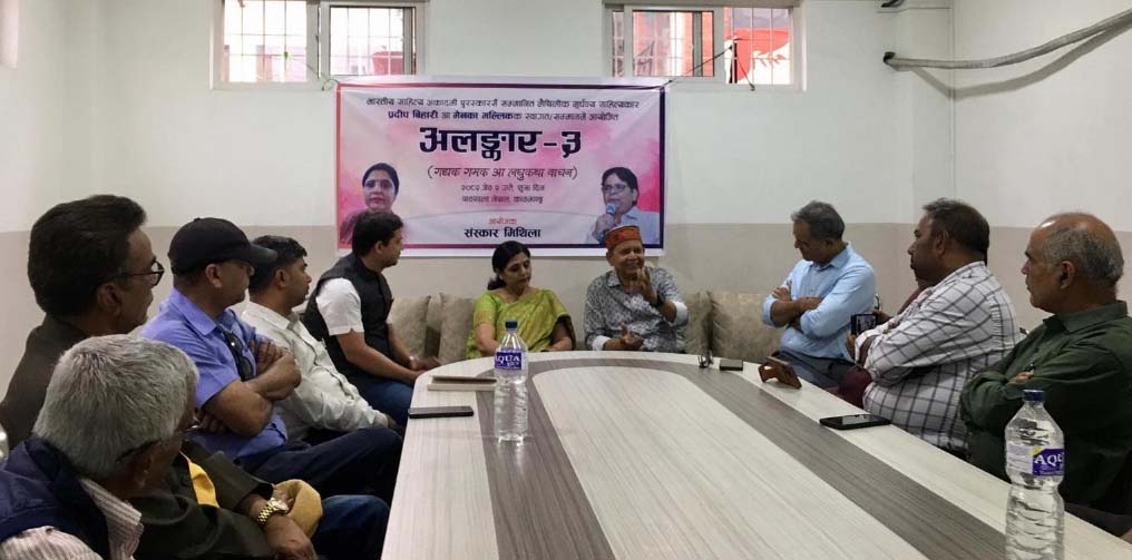 उक्त कार्यक्रममा मैथिली साहित्यको लघुकथा विधामा केन्द्रित रही कथाकार मेनका मल्लिक र प्रदीप बिहारीसँग साहित्यकार धीरेन्द्र प्रेमर्षि र विकास वत्सनाभले अन्तरक्रिया गर्नुभएको थियो । कार्यक्रममा डा रामदयाल राकेश, मधेस प्रदेशसभा सदस्य मनिष सुमन, साहित्यकार विभा झा, रूपा झा, गजेन्द्र गजुर, अमरेन्द्र यादवलगायत सहभागी हुनुहुन्थ्यो ।रासस