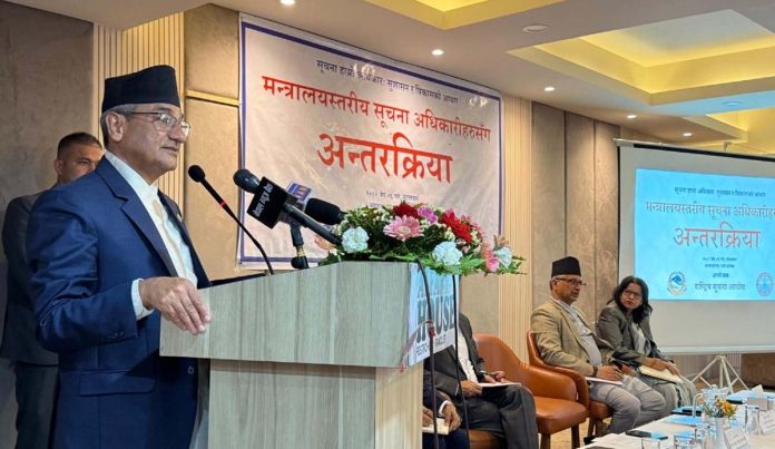 राष्ट्रिय सूचना आयोगले आज यहाँ आयोजना गरेको मन्त्रालयस्तरीय सूचना अधिकारीहरूसँग अन्तक्र्रिया कार्यक्रमलाई उहाँले संविधानमा सूचनाको हकलाई मौलिक हकका रुपमा राखिएको बताउनुभयो ।
