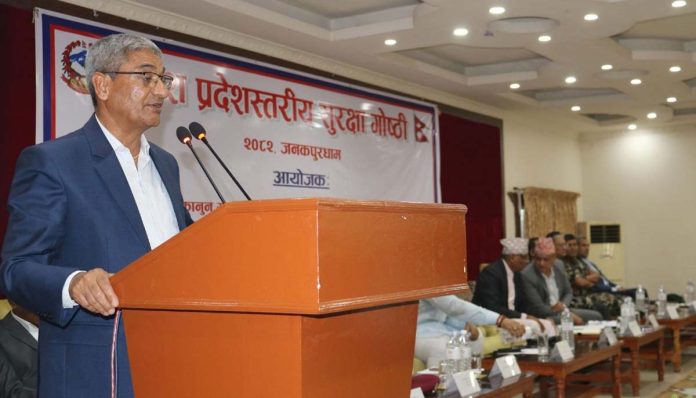 नेपाल सरकार गृह मन्त्रालय र मधेश प्रदेशको विभागीय मन्त्रालयद्वारा आज यहाँ आयोजित प्रदेशस्तरीय सुरक्षा गोष्ठीको उद्घाटन गर्दै उहाँले खुल्ला सिमाना रहेकाले सुरक्षाको सवालमा उच्च सतर्कता अपनाउन निर्देशन दिनुभयो ।