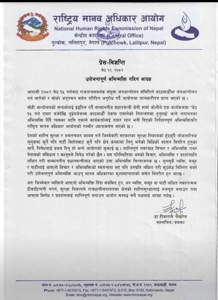 आगामी जेठ १५ गतेवाट राजतन्त्र समर्थक संयुक्त जनआन्दोलन समितिले काठमाडौंमा जनआन्दोलन गर्न लागेको र सोही आन्दोलनको सन्दर्भलाई इङ्गित गर्दै प्रधानमन्त्री केपी शर्मा ओलीले एक कार्यक्रममा ‘जेठ १५ गते एघार बजेदेखि दुर्ईबजेसम्म काठमाडौं नेकपा एमालेको नियन्त्रणमा हुनुपर्छ लगायतका अभिव्यक्ति दिँदै त्यसका लागि एमाले कार्यकर्तालाई तयार रहन भनी दिएको निर्देशनपूर्ण अभिव्यक्तिप्रति राष्ट्रिय मानव अधिकार आयोगको गम्भीर ध्यानाकर्षण भएको जनाएको छ ।