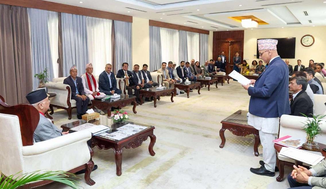महासङ्घका नवनिर्वाचित अध्यक्ष गोविन्दप्रसाद घिमिरे नेतृत्वको टोलीले प्रधानमन्त्री निवास, बालुुवाटारमा आज प्रधानमन्त्री ओलीलाई सात बुँदे सुुझावपत्र बुुझाएको हो । महासङ्घले अर्थतन्त्र ओरालो लागेका बेला आगामी आर्थिक वर्षको नेपाल सरकारको बजेटमा आर्थिक वृद्धि र निर्यात व्यवसायलाई प्राथमिकता दिने रणनीतिहरु कार्यान्वयनका लागि आग्रह गर्दै सम्बोधन हुन छुुट भएका विषयमा ध्यानाकर्षण गराएको छ ।