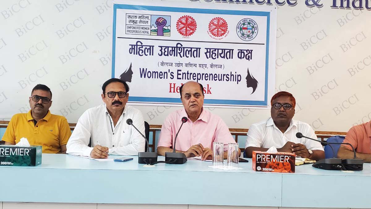वीरगंज ५ असार । वीरगंज उद्योग वाणिज्य संघमा महिला उद्यमशीलता सहायता कक्षको उदघाटन गरिएको छ । कार्यक्रमका प्रमुख अतिथि नेपाल उद्योग वाणिज्य महासंघ मधेश प्रदेशका अध्यक्ष अशोक टेमानीले रिबन काटेर सहायता कक्षको उदघाटन गर्दै महिला सशक्तिकरण र आत्मनिर्भरता अभिवृद्धिका लागि यस्तो पहल आवश्यक र सराहनीय भएको उल्लेख गर्नुभयो । उहाँले महिलाहरूले उद्यमशिलता तर्पm देखाएको अत्यन्तै महवपूर्ण रहेको उल्लेख गर्दै संघको यो पहलले नयाँ सम्भावनाको ढोका खोल्ने विश्वास व्यक्त गर्नुभयो । वीरगंज उद्योग वाणिज्य संघका अध्यक्ष हरि प्रसाद गौतमको अध्यक्षतामा आयोजित कार्यक्रममा बोल्दै अध्यक्ष गौतमले संघले आगामी दिनमा महिला उद्यमीलाई आवश्यक सहयोग र सहजीकरण गर्दै जाने प्रतिवद्धता ब्यक्त गर्नुभयो । महिला उद्यमीहरूको सशक्तीकरण र व्यवसायिक क्षमता अभिवृद्धि, बजार पहुँच, तालिम तथा आवश्यक परामर्श प्रदान गर्नका लागि सहायता कक्ष सञ्चालन गरिएको भन्दै महिलाहरूको योगदान बिना कुनै पनि आर्थिक विकास सम्भव नरहेको बताउनु भयो । वीरगंज महानगरपालिका कार्यालयका प्रशासकीय अधिकृत अरबिन्दलाल कर्णले सहायता कक्ष सञ्चालनका लागि महानगर आवश्यक स्थान उपलब्ध गराउने भन्दै नगरपालिकाले यस्ता कार्यक्रमप्रति संधै सकारात्मक सहयोग रहने धारणा व्यक्त गर्नुभयो । नेपाल उद्योग वाणिज्य महासंघका महानिर्देशक हरि पौडेलले महिलाहरूमा उद्यमशीलताको भावना जागृत गराउन र उनीहरूलाई स्वरोजगारतर्पm उन्मुख गराउन सहायता कक्षले महŒवपूर्ण भूमिका खेल्ने विश्वास व्यक्त गर्नुभयो । संघले स्थापना गरेको महिला उद्यमशीलता सहायता कक्षमार्पmत महिलाहरूलाई व्यवसायिक सल्लाह, तालिम, जानकारी तथा प्रोत्साहन प्रदान गरिने महिला उद्यमशीलता सहायता कक्षका सहजकर्ता संजु कलवारले बताउनु भयो । कार्यक्रममा घरेलु तथा साना उद्योग कार्यालय पर्साका प्रमुख पवन पंजियार, वीरगंज उद्योग वाणिज्य संघका वरिष्ठ उपाध्यक्ष माधव राजपाल, उपाध्यक्ष आशिष लाठ, कोषाध्यक्ष अनोज रूंगटा, सहसचिव अनुप अग्रवाल, महिला समृद्धि नेपाल कार्यक्रम मधेश प्रदेशका सदस्य डा.बासुलाल कर्ण लगायत संघका पदाधिकारी तथा व्यवसायीहरूको उल्लेखनीय उपस्थिति रहेको थियो ।