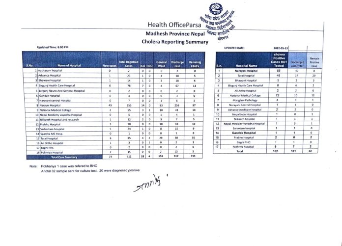 आज साँझ ६ बजेसम्मको तथ्याङ्क अनुसार हालसम्म वीरगंज र आसपासका क्षेत्रमा ७७ जना हैजाको संक्रमण देखिएको हो । शुक्रवार १०१ जना विरामीलाई डिस्चार्ज गरिएको छ । अझै पनि १९५ जना संक्रमितको विभिन्न अस्पतालहरूमा उपचार भइरहेको छ। कुल ७१२ जनामध्ये ५१७ जना हैजाको बिरामी निको भएर घर फर्किसकेको तथ्याङ्कमा उल्लेख छ।